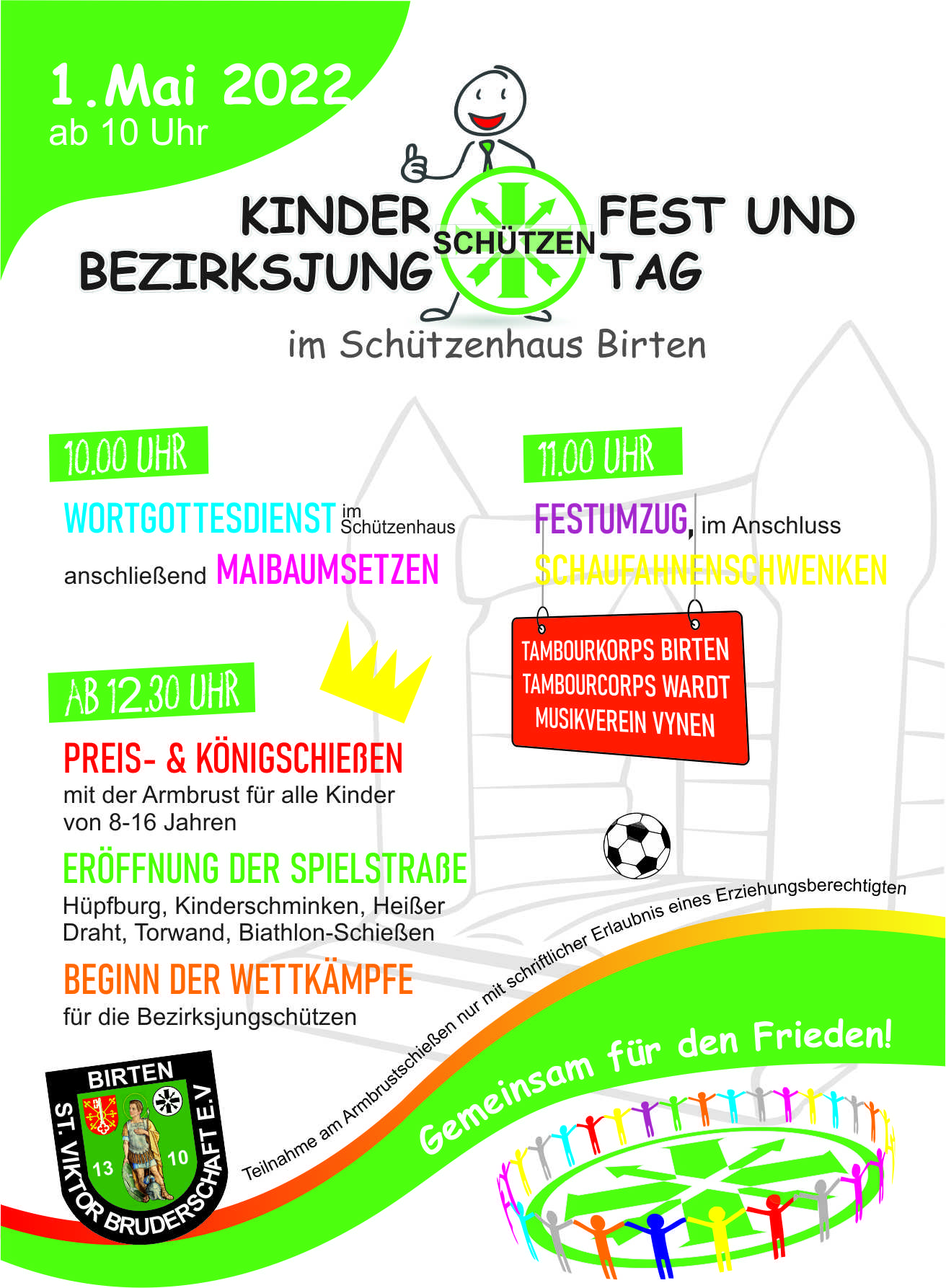 Zu Ehren von unserem Diözesankönigspaar Klaus und Bärbel Ratz, feierte die St. Viktor Bruderschaft ein Diözesankönigsfest. Das hat es in der Bruderschaft in der fast 1000-jährigen Geschichte noch nicht gegeben. Das Fest begann mit einem Gottesdienst, der durch eine Abordnung vom Musikverein Vynen durch ihre Blasmusik den festlichen Rahmen erhielt. Nach dem Gottesdienst startete der große Festumzug. Zu den Königspaaren gehörte nicht nur das Europa Königspaar Leo und Irma Niessen mit seinen Adjudanten, sondern auch das Bundeskönigspaar Hans und Gabi Lummer und die Diözesankönigspaare aus Aachen, Essen Köln, Paderborn, Trier und Münster und weit mehr als zehn Schützenbruderschaften aus dem Bezirksverband Moers. In der Schützenhalle begann das Fest mit den Grußworten von Thomas Görtz und dem Brudermeister Hans-Georg Angenendt. Der Diözesanbundesmeister Bernard Heitkamp hielt noch eine besondere Überraschung bereit. Er verlieh dem Diözesankönig Klaus Ratz für sein ehrenhaftes Engagement in der Bruderschaft das St. Sebastianus Ehrenkreuz. Zur Unterhaltung der Gäste fand ein Vogelschießen für alle anwesenden amtierenden Könige und Königinnen statt. Dieses brachte folgendes Ergebnis: